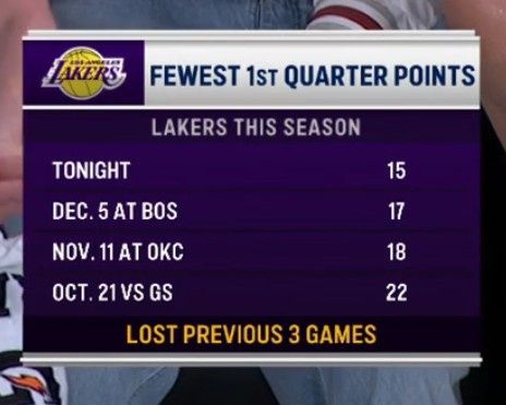 在本场比赛上半场,湖人以39-54落后于快船,球队三分球19投仅2中,命中率11%。39分也是湖人本赛季半场的第二低分,最低的是打雷霆,仅得38分。