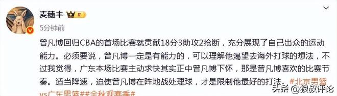 媒体人“麦穗丰”发文点评:曾凡博回归CBA的首场比赛就贡献18分3助攻2抢断,充分展现了自己出众的运动能力。必须要说,曾凡博一定是有能力的,可以理解他渴望去海外打球的想法,不过我觉得,广东本场比赛主动求快其实正中曾凡博下怀,那是曾凡博喜欢的比赛节奏。适当降速,迫使曾凡博在阵地战处理球,才是限制他最好的打法。